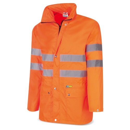 Chaqueta con protección a la Lluvia y de alta visibilidad. Costuras termoselladas. Capucha ajustable mediante cordel con tancas, del mismo tejido de la prenda. Cierre frontal por cremallera inyectada de color negro y 2 bolsillos de parche, inferiores en ambos delanteros.Compatible con pantalón 288PAFNF.Composición: Tejido: 100% poliéster (con recubrimiento de PU).